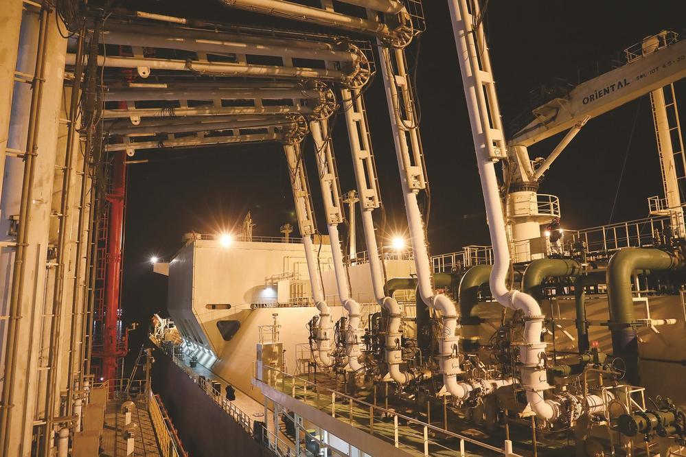 京唐LNG公司专用码头5条卸料臂,为ZARGA轮施行夜间卸载作业。 殷缘旦 摄